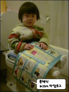 - 변기에 오랫동안 앉혀도 괜찮을만큼 좋아하는 책을 물색하라 ㅡ 핑키한테 쉬아하러 가자하면 안가려고 떼를 쓰는데, 시계책 읽으면서 쉬아하러 가자하면 냉큼 자기가 앞장섭니다. 시계책이 뭐냐고요? IKEA 2005년 카달로그. 시계라는 단어를 배울 때쯤해서 시계 사진이 많아 보여주기 시작했는데, 이게 지금 핑키가 가장 좋아하는 책이 되어버렸습니다. 백장 넘는 책장넘기는 동안 꿈쩍~않고 변기에 앉아있습니다(예. 아까 그 아빠 읽어줬다는 책이 이 카달로그예요.ㅡㅡ;; 시계도 나오고요, 고양이도 있구요, 강아지도 나오구요, 꽃도 나오구요....)