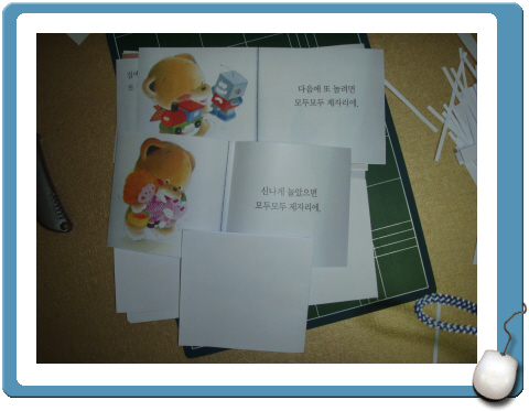 종이가 넘 힘이 없다 싶으면 이면지로 이렇게 붙인다음 책 한페이지 한페이지를 잘라서 또 붙이면 네겹이 되서 더 튼하겠죠?