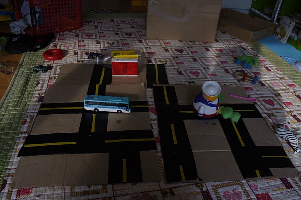 까만시트로 도로 만들고, 노란시트지로 중앙선 만들고...